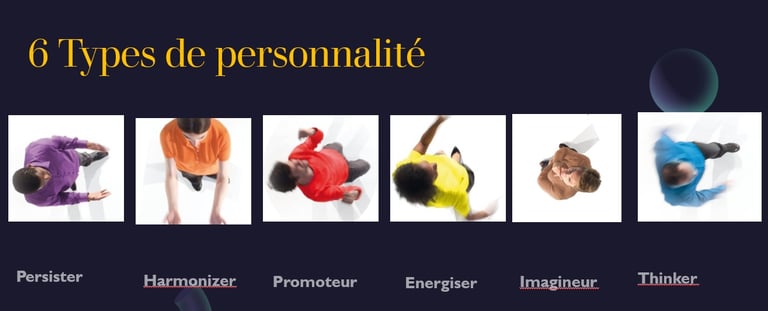 Il existe 6 types de personnalité dont chacun développe plus ou moins les caractéristiques au cours de son histoire. Nous avons un type de personnalité de base acquis pour la vie et un type de phase qui détermine nos sources de motivation psychologique actuelles et nous indique les réactions les plus probables que nous aurons en cas de stress.