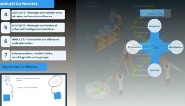Parcours de 5 modules d’une dizaine de jours étalés sur une dizaine de mois pour une montée en compétences des Managers dans leur rôle de mobilisation et d’engagement de leurs équipes et dans leur efficacité professionnelle.